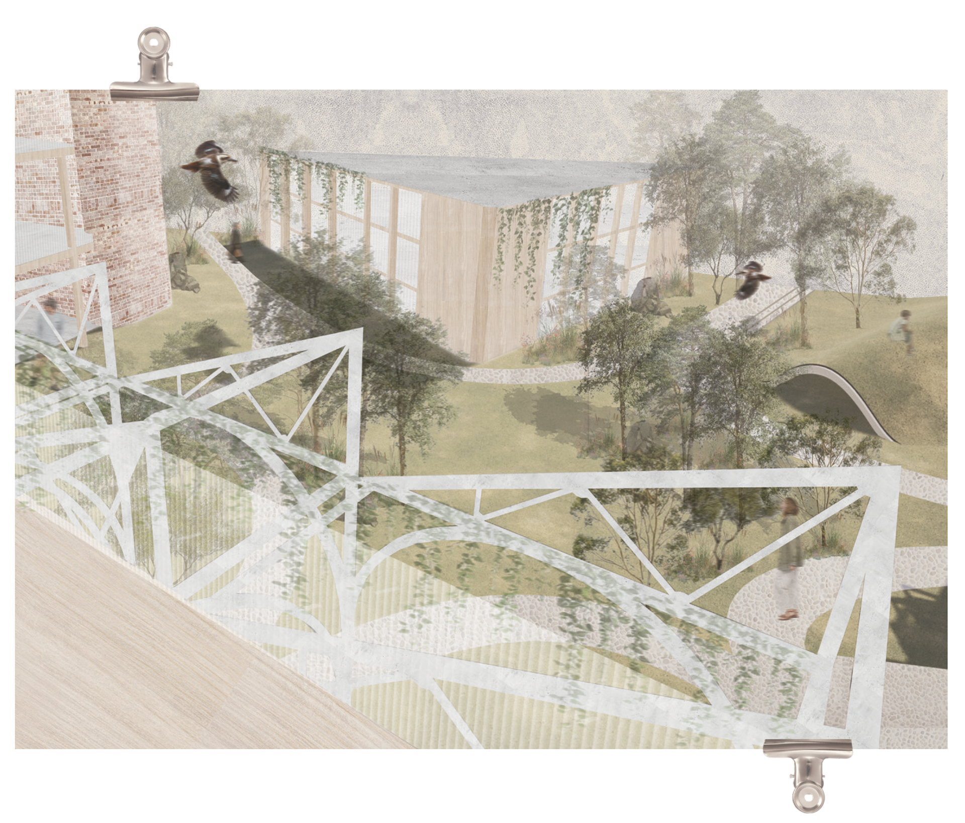 New planted pathways extend existing networks through the site, functioning as both circulation and civic ground that organises programs and invites informal gathering. A landscape strategy reinstates former wetland ecologies through layered vegetation, shaded groves, and water-sensitive planting, creating immersive habitats that attract birds, pollinators, and small wildlife while framing everyday movement.