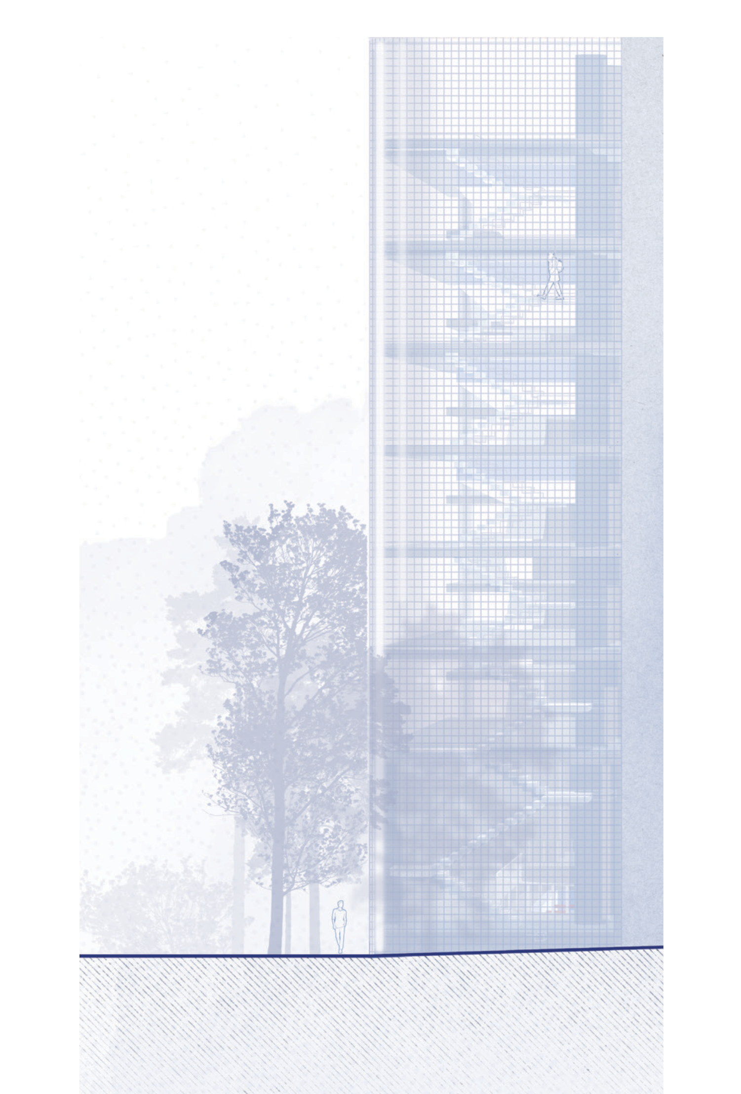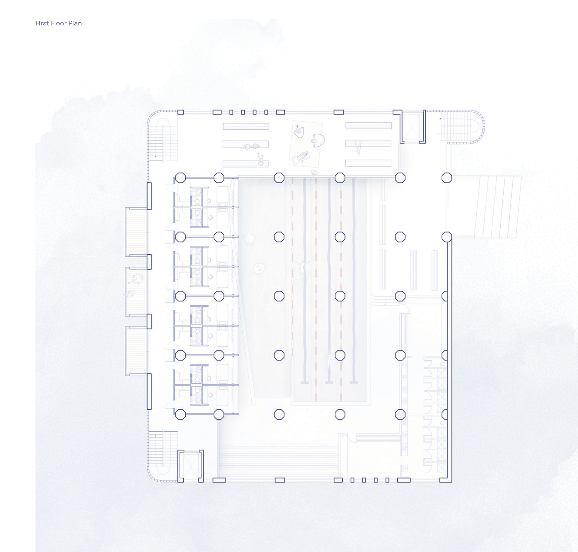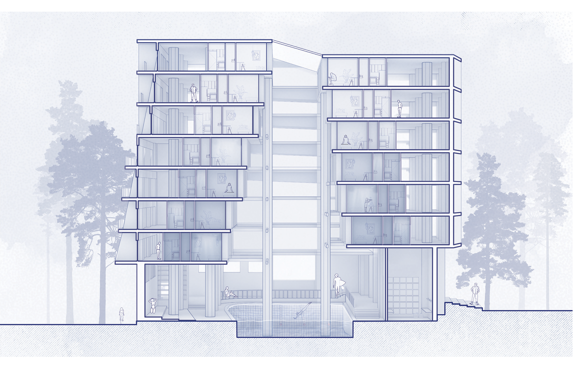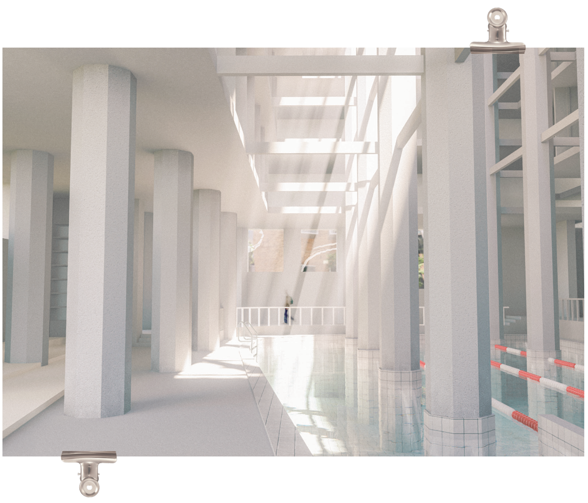 This project explores swimming pools as spatial instruments for mental wellbeing within a student accommodation context. Set within UTS Building 15, the proposal threads water through the scheme as a reflective, calming presence, arranging pools on every level to encourage everyday use as places of retreat and contemplation. The sensory qualities of shifting light, ripples, and reflections extend from shared pool decks into the private rooms, immersing residents in a continuous atmosphere of quiet and repose throughout the building.